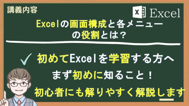 (Excel初級編)0からの学習編 0-1-3(0からの学習編)Excelの画面構成と各メニューの役割とは 2022年9月23日 ひろふみ ひろふみのエクセル知恵袋 この記事で習得できること Excelの画面構成 Excelの各部の役割 Excelのブック・シート・セルとは何か Ex …