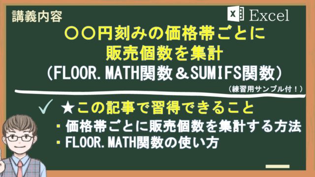 現場の実務編 【現場の実務編19】〇〇〇円刻みの価格帯ごとに販売個数を集計(FLOOR.MATH関数&SUMIFS関数) 2022年10月28日 ひろふみ ひろふみのエクセル知恵袋 ・価格帯ごとに販売個数を集計する方法 ・FLOOR.MATH関数の使い方 練習用サンプルデータ(ダウンロード)※シートは …