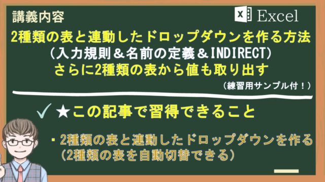 現場の実務編 【現場の実務編15】2種類の表と連動したドロップダウンを作る方法(入力規則&名前の定義&INDIRECT)さらに2種類の表から値も取り出す 2022年10月25日 ひろふみ ひろふみのエクセル知恵袋 ・2種類の表から参照範囲を自動で切り替えて値を取り出す 練習用サンプルデータ(ダウンロード)※Excelは練習用(問題)と成果 …
