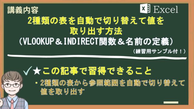 現場の実務編 【現場の実務編14】2種類の表を自動で切り替えて値を取り出す方法(VLOOKUP&INDIRECT関数&名前の定義) 2022年10月24日 ひろふみ ひろふみのエクセル知恵袋 ・2種類の表から参照範囲を自動で切り替えて値を取り出す 練習用サンプルデータ(ダウンロード)※シートは練習用と成果物(解答)の …