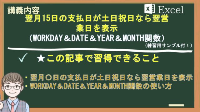 現場の実務編 【現場の実務編17】翌月15日の支払日が土日祝日なら翌営業日を表示(WORKDAY&DATE&YEAR&MONTH関数) 2022年10月26日 ひろふみ ひろふみのエクセル知恵袋 ・翌月〇日の支払日が土日祝日なら翌営業日を表示・WORKDAY&DATE&YEAR&MONTH関数の使い方 練習用サンプルデー …