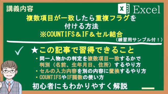 現場の実務編 【現場の実務編7】複数項目が一致したら重複を付ける方法紹介※COUNTIFSやIF、セル結合のテクニック 2022年10月15日 ひろふみ ひろふみのエクセル知恵袋 ・同一人物かを複数項目が一致するかで判別するやり方 ・セルの入力内容を別の内容に置換するやり方 ・COUNTIFSやIF関数 …