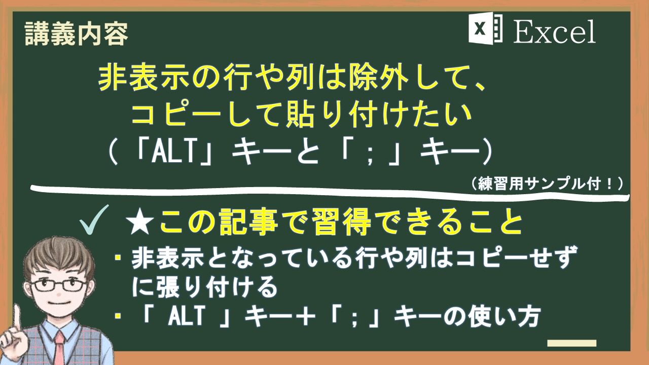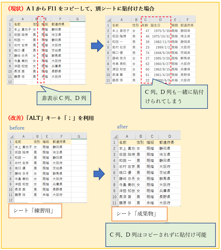 「ALT」キー+「;」キーを使う必要はありません。通常のコピー&ペーストで非表示を除いて貼付けが可能です。