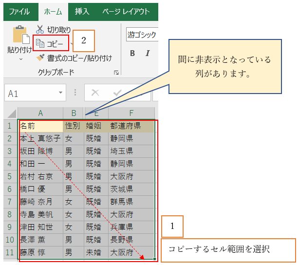 【2】非表示の行や列を外してコピー&ペースト