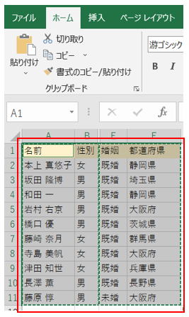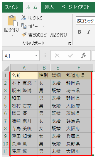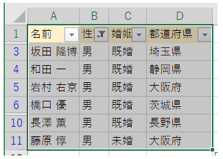 ‘③すると、「男」のみにデータが絞り込まれるので、A1からD11を範囲選択しコピーしてください。(コピー:CTRLキー+Cキー)