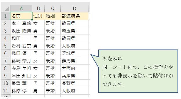 非表示したC列もD列も、一緒に張り付けられる
