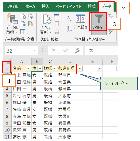 ‘①タイトル行「1」を選択し、「データ」タブの「フィルター」をクリック。