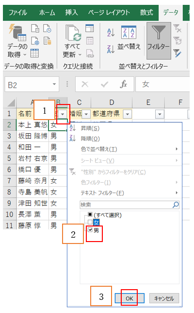 ‘②B1の「フィルター」をクリックし、「男」のみにチェックを入れて、「OK」