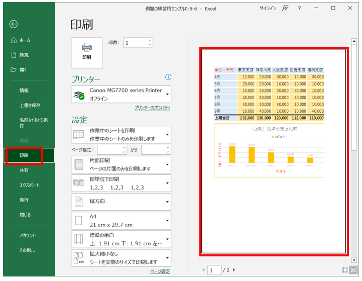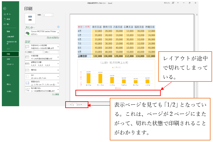 作成した表やグラフを印刷する際は、印刷実行前に必ず印刷プレビューで印刷結果を確認する必要あります。そうしないと、本来1枚で印刷しないといけない表やグラフが、複数枚に割れて印刷実行されてしまう可能性があります。