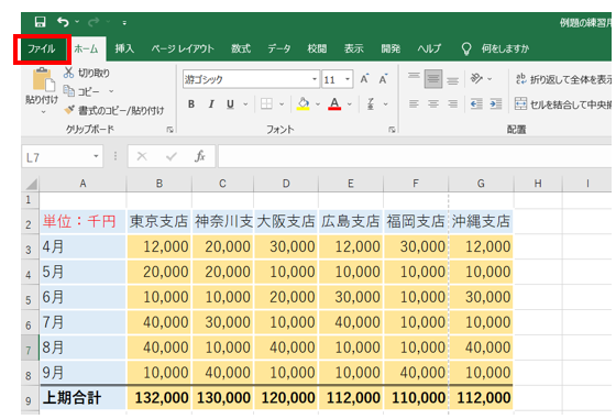 ‘練習用のダウンロードファイル「例題の練習用サンプル0-6-1」のExcelを開いてください。シート「練習用」の印刷プレビュー画面を見ると以下のように表示されます。