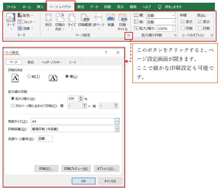 印刷対象がページ内に収まるように、印刷サイズ、印刷向きや余白などの調整は、ページレイアウトタブからも設定できます。