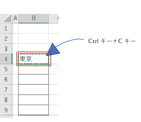 (解説)ここでは、セルB4の東京を選択しコピーをします。コピーはキーボードの(Ctrlキー+Cキー)を押すことでコピーができます。