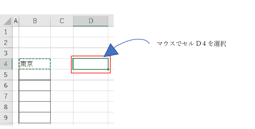 (解説)先ほどコピーしたセルを、張り付けるために、張り付ける先頭のセルD4を選択します。