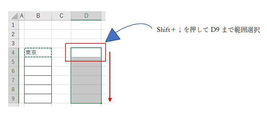 ③D4からShiftキーを押しながらキーボードの↓(下向きの矢印)を押して、D9まで選択