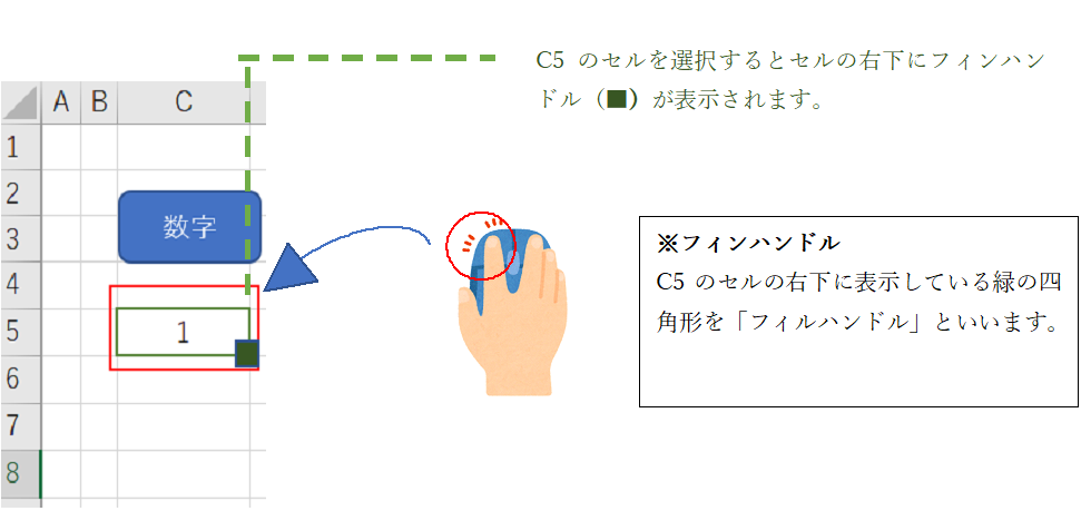 (解説)選択したセルをよく見るとセルの右下に緑の四角形があるので、そこにマウスのカーソルを合わせてください。