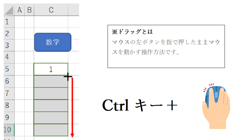 (解説)連続した数値を入力したい場合は、Ctrlキーを押しながら、マウスを下に動かすと、動かしたセルの範囲まで連続した数値を入力することができます。