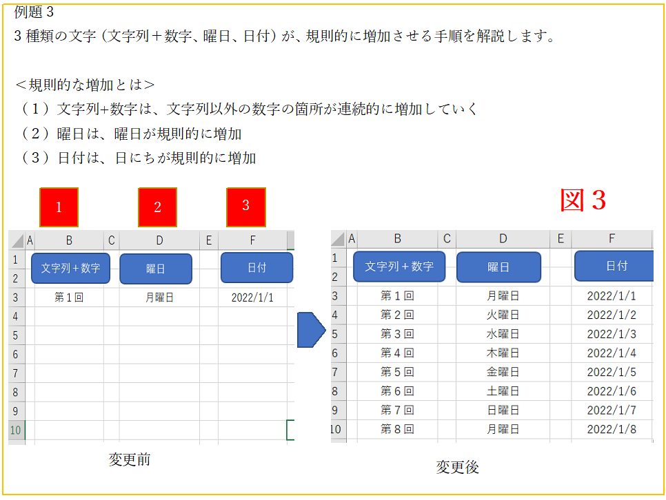 ※「文字列+数字」「曜日」「日付」それぞれ一つずつオートフィルを実行してください。