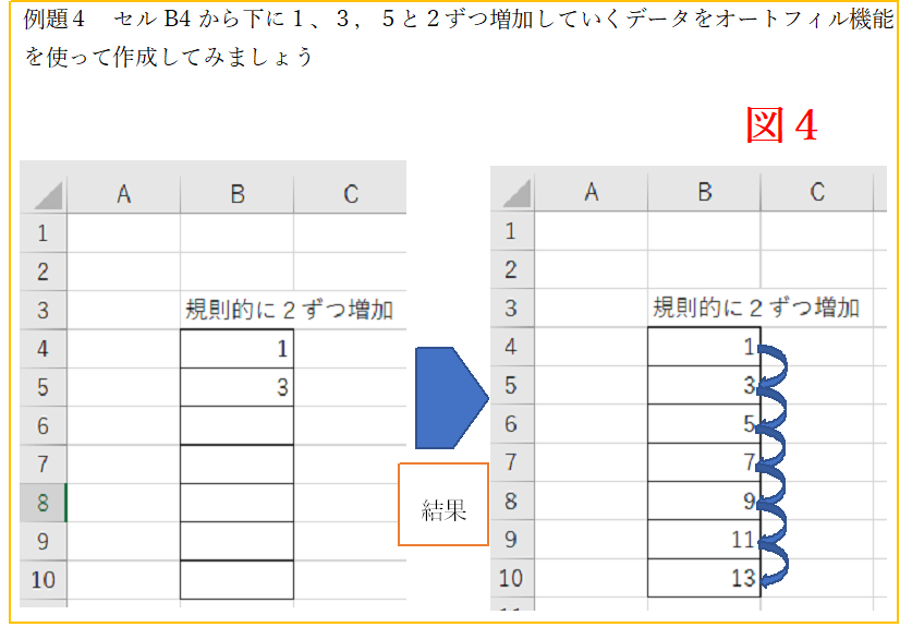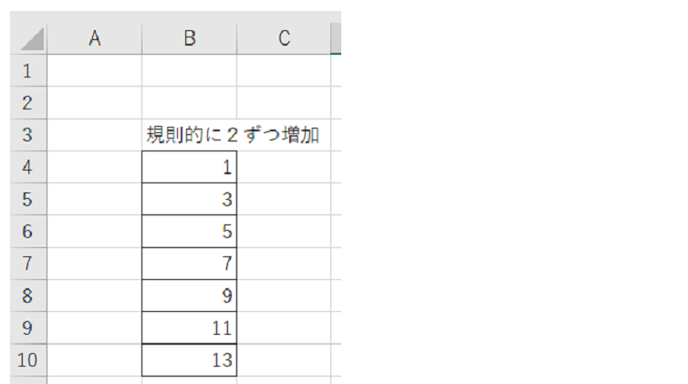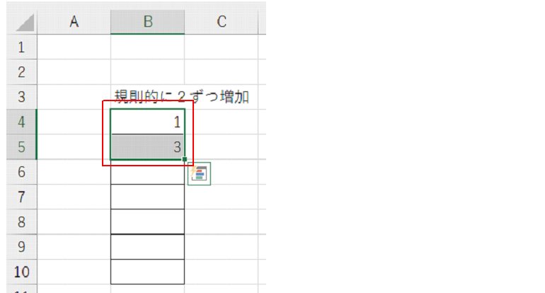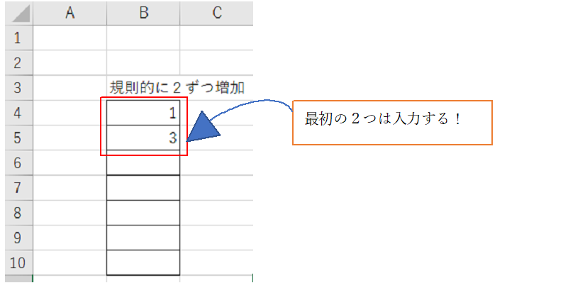 ①まずは、最初の2行だけ、セルB4に「1」とセルB5に「3」に数値を手入力し打ち込んでください。