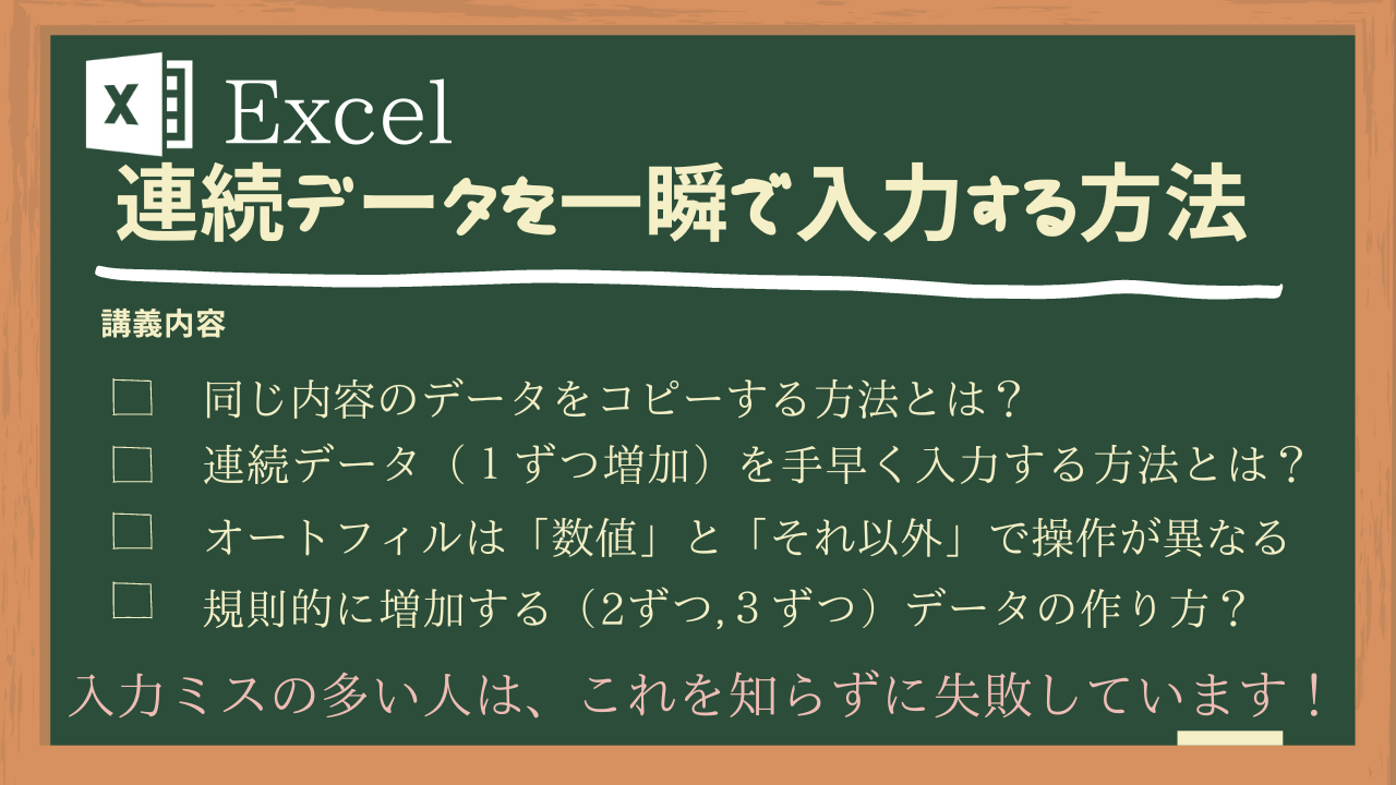 【セルの理解編02】(初級)Excelの連続データを一瞬で入力する方法解説。連続した数値の入力はオートフィル機能を使って時短しよう!!