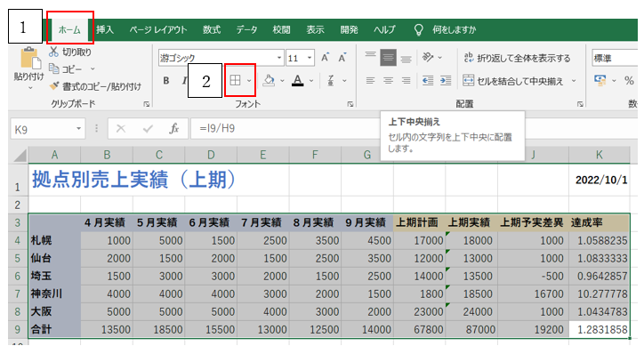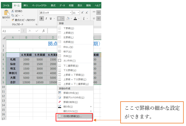 シートに必要なデータを入力したら、表が見やすいよう罫線を引きます。「ホーム」タブの「罫線」を利用することで簡単に線を引くことができます。実際に入力しながら調整してみましょう。