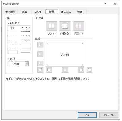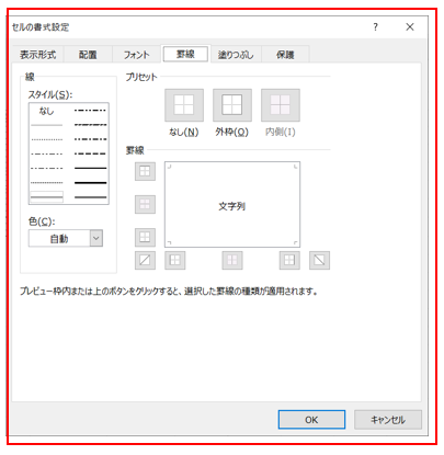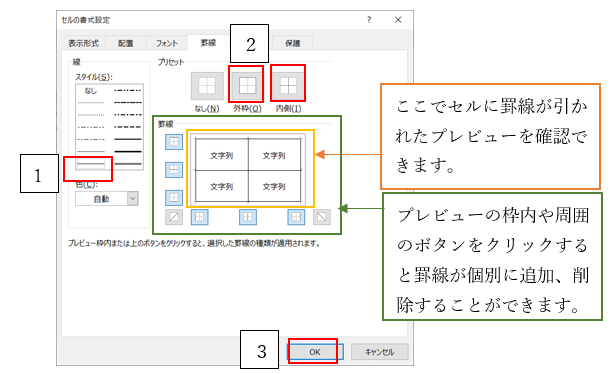 ‘④罫線タブで、線のスタイルを「―」を選択、プリセットを「外枠」、「内側」を選択しOKをクリックする。
