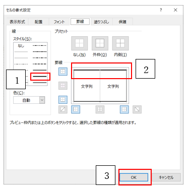 ‘②セルの書式設定を開きます(CTRLキー+1キーを押してください)