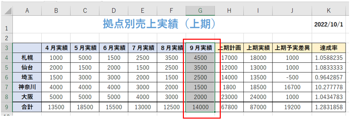 ‘⑬9月実績(G列)の右側に右二重罫線が引かれました。
