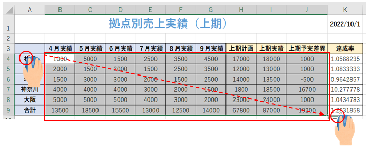 ‘①まず、表のA3からK9までドラッグして範囲選択します。
