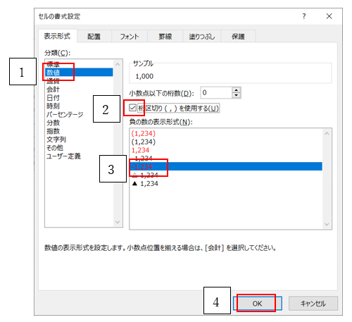 ‘③分類で「数値」を選択、カンマ区切りにチェックを入れ、負の数の表示形式は、「-1,234」を選択しOKをクリック。