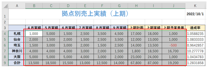 (金額を千円単位で「,」区切りにし、マイナスは赤字で表示するようにセルを設定します)