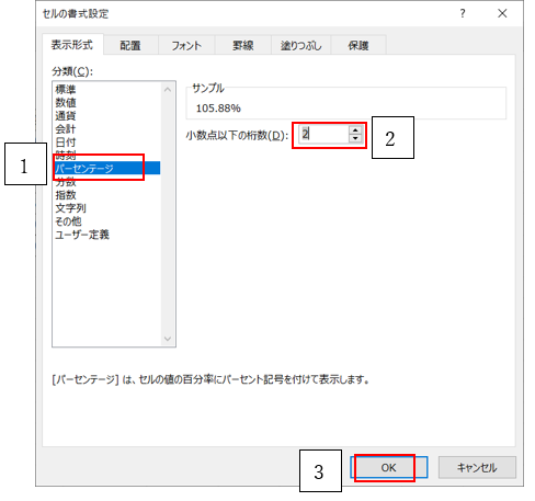 ‘⑧分類で「パーセンテージ」を選択、小数点以下の桁数を2にし、OKをクリック。