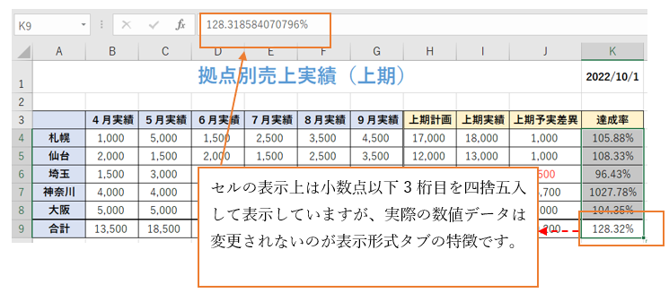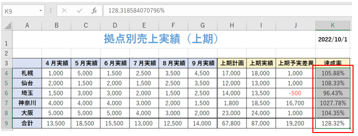 ‘⑨達成率の表示形式が%になり、小数点以下2桁まで表示されました。