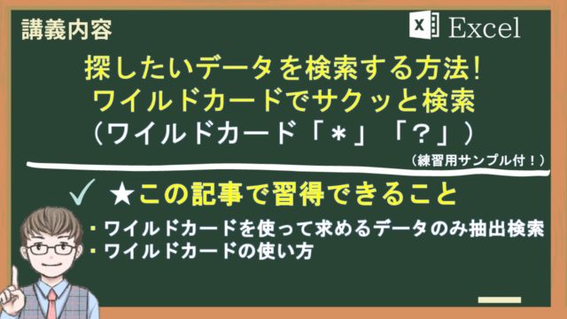 現場の実務編 【現場の実務編43】探したいデータを検索する方法。ワイルドカードでサクッと検索(ワイルドカード「*」「?」) 2022年11月24日 ひろふみ ひろふみのエクセル知恵袋 ・ワイルドカードを使って求めるデータのみ抽出検索 ・ワイルドカードの使い方 練習用サンプルデータ(ダウンロード)※シート …