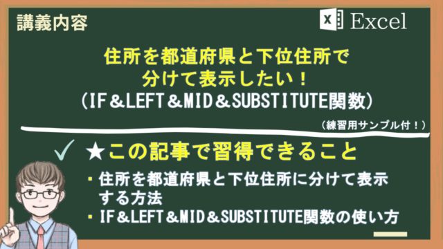 現場の実務編 【現場の実務編46】住所を都道府県と下位住所で分けて表示したい!(IF&LEFT&MID&SUBSTITUTE関数) 2022年11月27日 ひろふみ ひろふみのエクセル知恵袋 ・住所を都道府県と下位住所に分けて表示する方法 ・IF&LEFT&MID&SUBSTITUTE関数の使い方 練習用サンプ …
