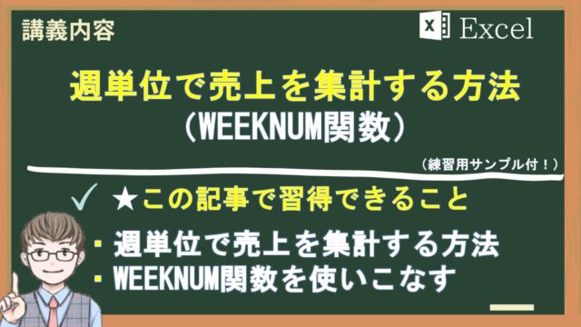 現場の実務編 【現場の実務編34】週単位で売上を集計する方法(WEEKNUM関数) 2022年11月14日 ひろふみ ひろふみのエクセル知恵袋 ・週単位で売上を集計する方法 ・WEEKNUM関数を使いこなす 練習用サンプルデータ(ダウンロード)※シートは練習用と成 …
