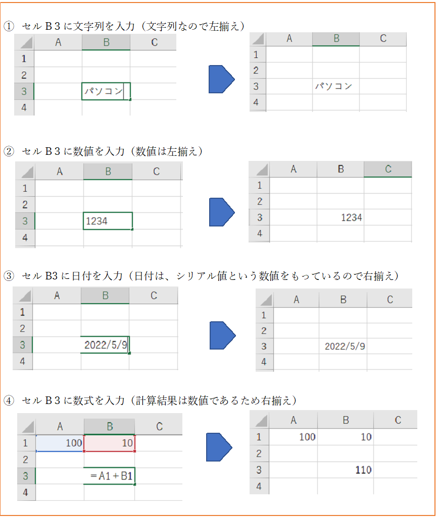 通常、エクセルは、この4種類を瞬時に判別して、自動的に、数値や文字列のデータをセルに格納します(図2)。通常の標準設定では、文字列は左揃え、数値は右揃えになる。