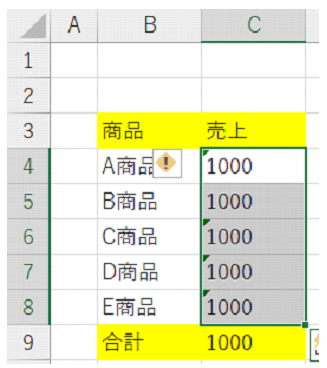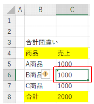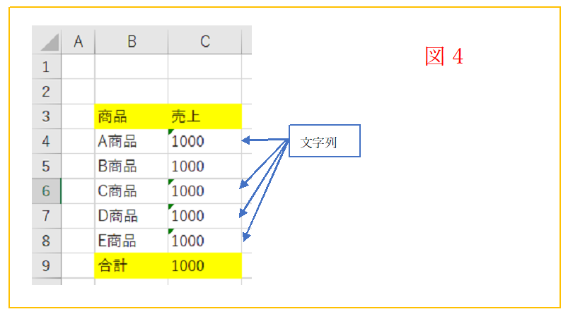 文字列になっている箇所に緑三角マークが表示される。この表示がでていると、合計したくとも合計できない。