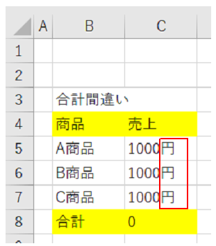 これも、初心者によくあるケースですが、数字に「円」を入力して、合計が計算されないと言っている人を見受けます。セルの一部に文字列を入力してしまうと、そのセルは、文字列となってしまうので、注意してくださいね。