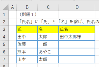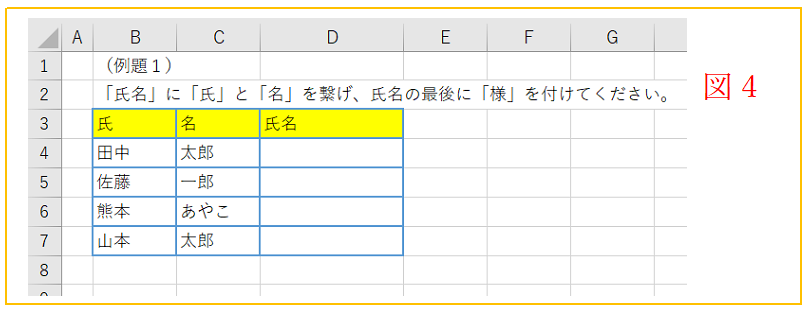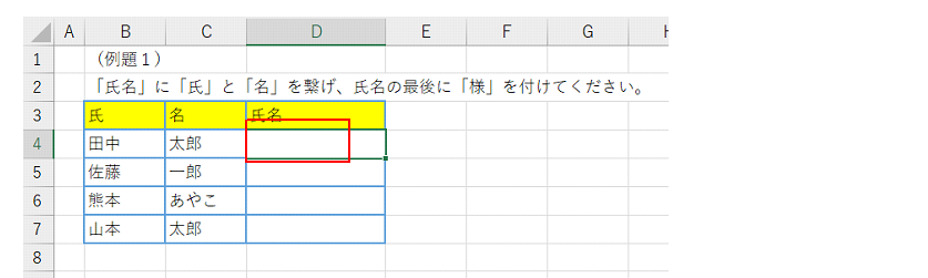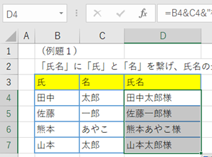 ⑦&の後ろに“様”を手入力し「ENTER」キーを押す(仕上げに様をつけます)するとセルD4に「=B4&C4&“様”」が表示されることがわかります。