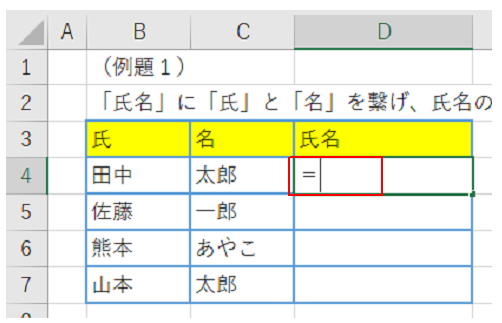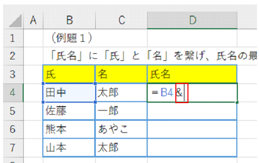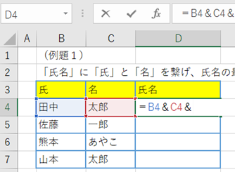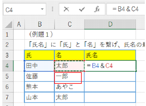 ⑤続いて、セルC4の「太郎」をマウスで選択するとセルD4に「=B4&C4」が表示されることがわかります。