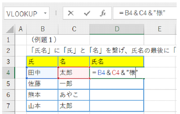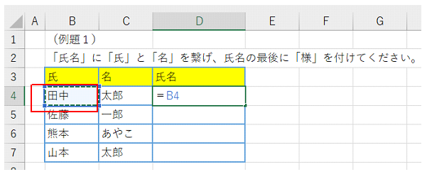 ⑥続いて「&」を入力(最後に様を付けるため)するとセルD4に「=B4&C4&」が表示されることがわかります。