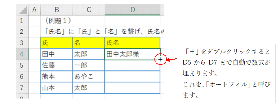 セルD4の右下の角をダブルクリック(他のセルD5からD7まで氏名を埋めていきます)