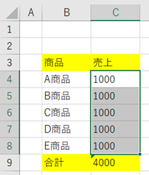 • 2つ目以降のセルが、黒色になっていると範囲選択が成功している目印(C4からC8)