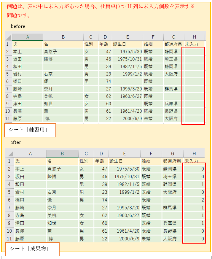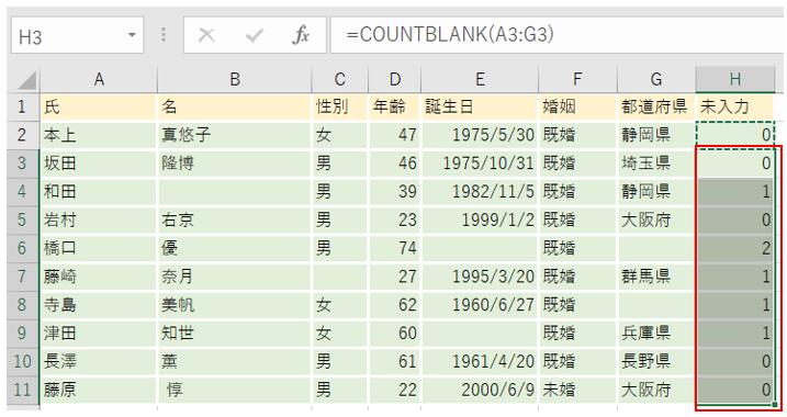 未入力箇所に空白の個数を数えるという例題の問題から外れますが、便利な方法なので