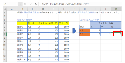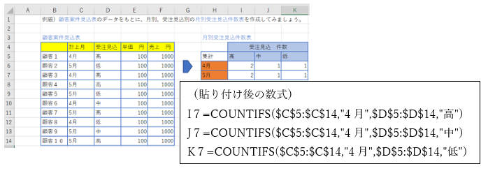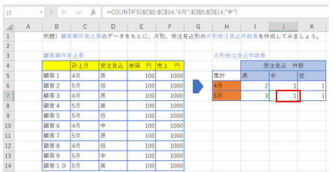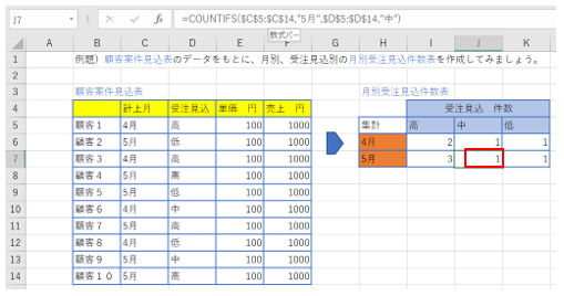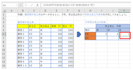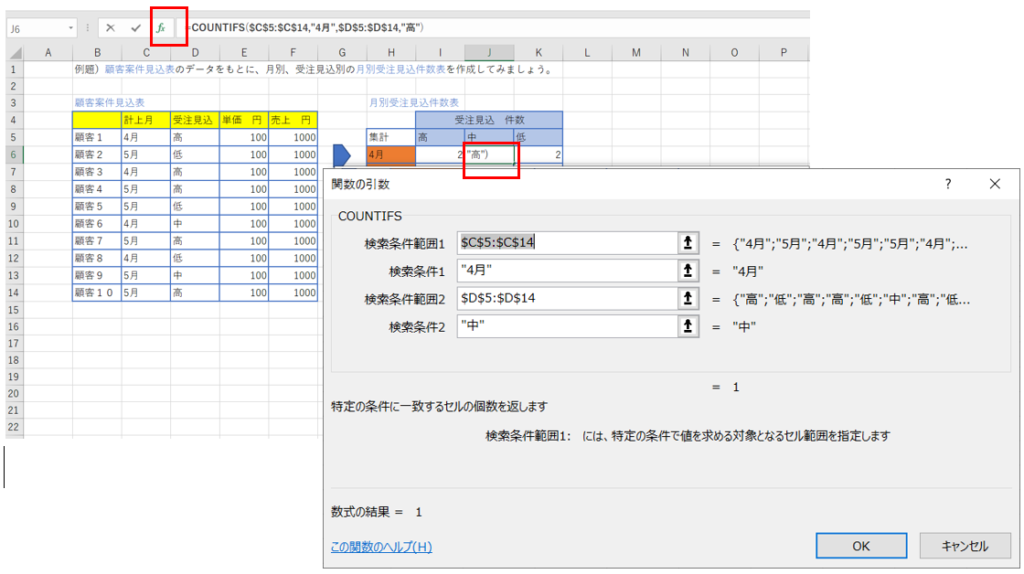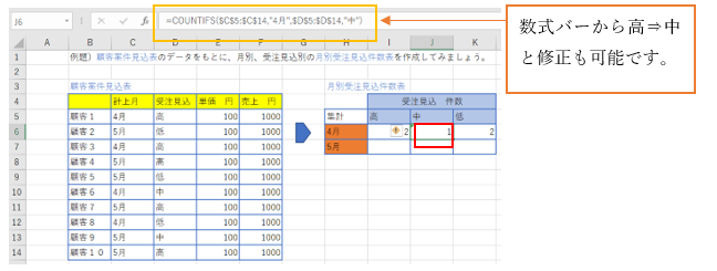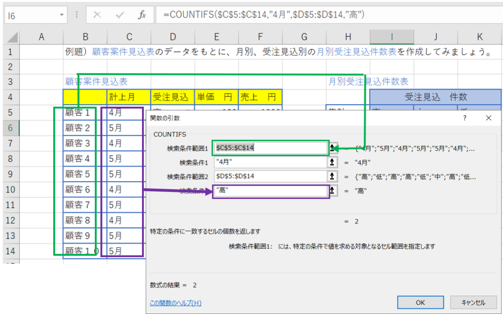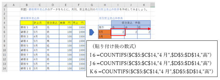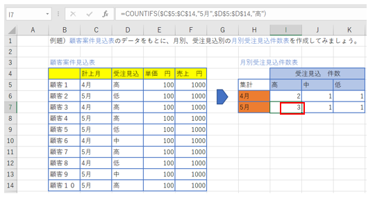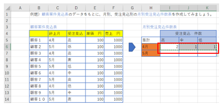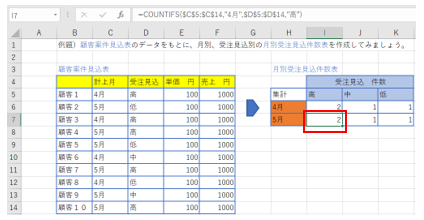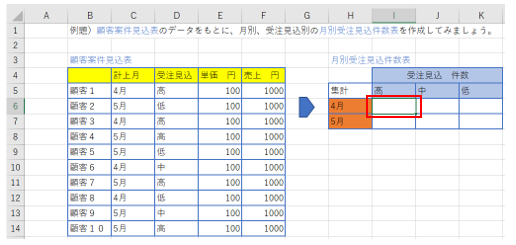 ①4月の受注見込「高」の件数を求めるため、セルI6を選択します。