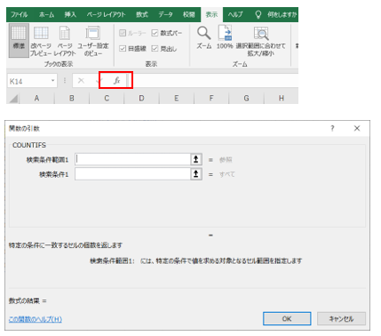 ②先ほど紹介した手順で、上部のメニューバーのfxからCOUNTIFSの入力画面を開いてください。