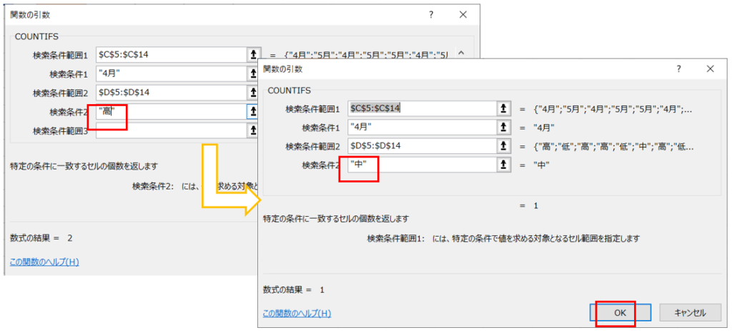 ④COUNTIFSの関数のダイアログボックスが開かれます。