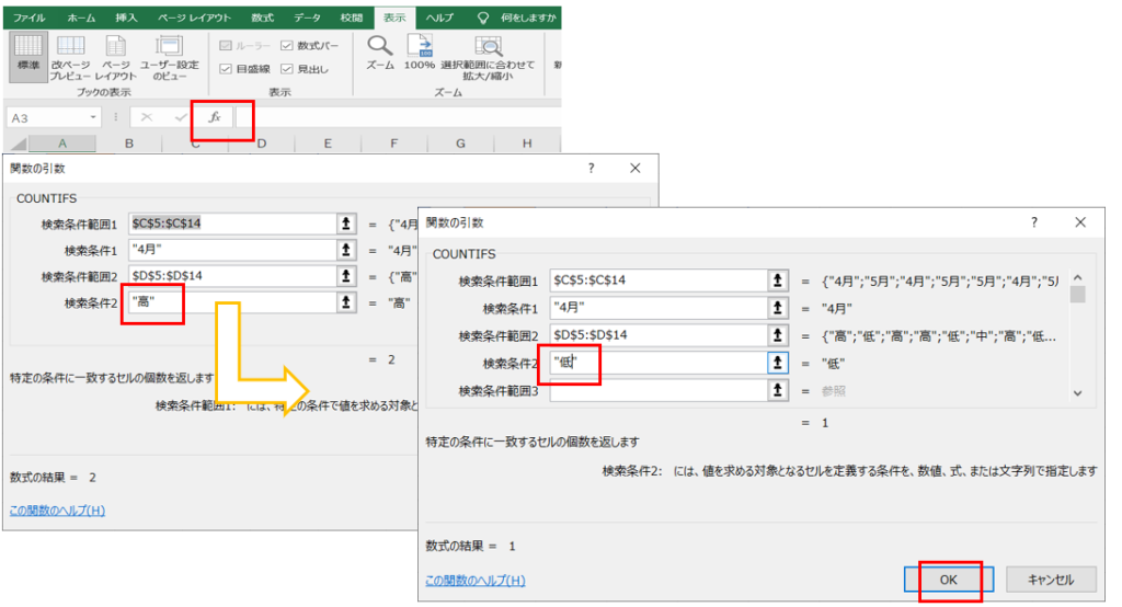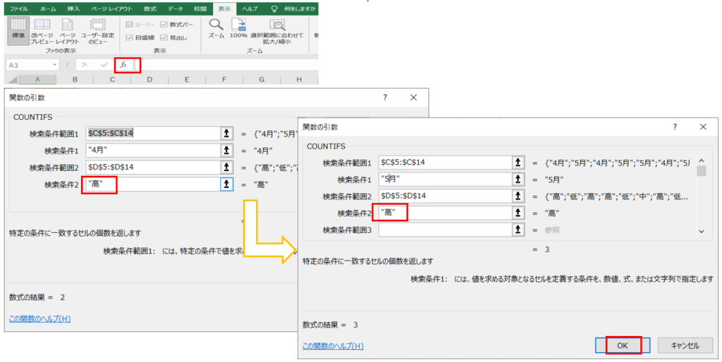 ③関数名にCOUNTIFSが表示されることを確認しOKクリック