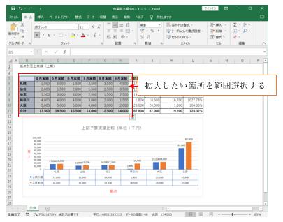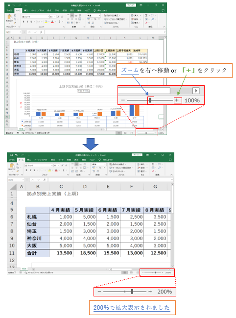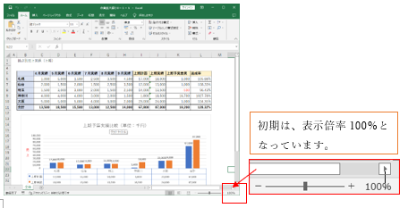 Excelの画面は、標準100%の表示倍率で設定されています。しかし、文字が小さすぎて醜い、また、文字が大きすぎて表の全体を把握できない時などは、表示倍率を変更することができます。見やすいように拡大・縮小する方法を覚えましょう。