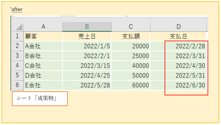 (練習で実施する「売上日の翌月末を算出」の完成図)